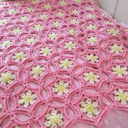 My Daisies for Days Blanket is the blanket version of my Daisies for Days Pillow. These projects are inspired by the daisy garland that I named my crochet Instagram after! It is the perfect blanket for spring and summer because it is made with cotton yarn, and the gaps between the hexagons ensure that it is lightweight. It is composed of nine rows of hexagons, and the join as you go method is utilized to join them. There are photos throughout the pattern to help you with all of the steps! I recently updated the pdf to include a chart for the hexagons. I used Blue Sky Fibers organic worsted cotton yarn, but any worsted weight yarn will work. You will need one skein of the color of the centers of the flowers, two skeins of the color of the petals, and eight skeins of the background color. The finished blanket is 53 by 38 in, but you could add or subtract rows as you please to make it the desired size!