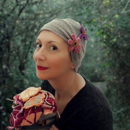 A simple stockinette hat worked in the round from the top down, featuring a high doubled hem and covered with a line of colorful flowers. The daisies modules are worked sideways featuring an i-cord center and petals shaped with short rows and are attached while working. The work is started from the daisy module chain, then the stitches for the top of the hat are picked up from the center of the first daisy module, the crown is worked top down to the hem, when the stitches are doubled to obtain the high hem. Finally, the flowers are fixed to the hat and the hem is slightly chinched to add some movement to it.