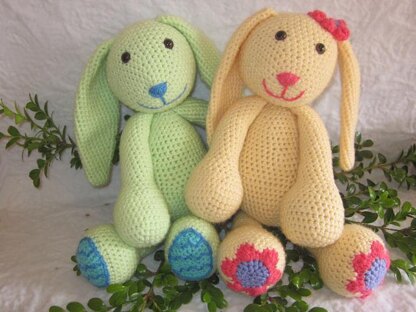 This is a 12 page pdf file with instructions for both bunnies. There are lots of picture to help with their special egg and flower legs.