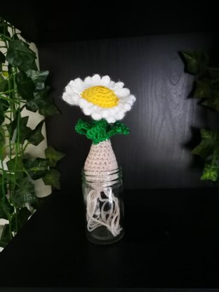 The crochet pattern is written using US crochet terms and includes instructions on how to make a daisy spring bulb.