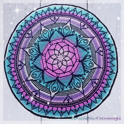 Have fun creating the delicate mandala motifs and central daisy design in mesmerising colour changing yarn!