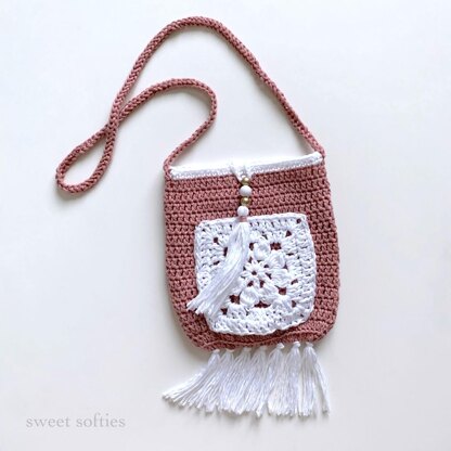The Daisy Dreams Boho Bag is a beautiful crossbody purse that is fun, easy, and quick to crochet! It features a floral granny square motif, a beaded tassel “button”, and whimsical mini tassels to add to its rustic and spirited farmhouse charm. The length of the strap is easily adjustable. This design can be customized in many ways, such as using different yarn color combinations and adding embellishments (e.g., beads, pom poms, buttons, appliques). This accessory makes a great gift for teen girls and women who love fashion. It can be a suitable present for different holidays and occasions, such as birthdays, Christmas, appreciation or thank you gifts, and more! This trendy bohemian piece will surely be a hit at craft fairs too.