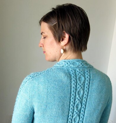 Simple style is combined with delicate cables and intriguing construction in the Daiva Cardigan. This open front cardigan with fitted 3/4 sleeves is worked in one piece from the top down, using the contiguous sleeve method developed by Susie Myers. Cables are worked along the neckband, center back, shoulder and center sleeve. I-cord is worked as you go to finish the front opening edge. Stitch patterns are written and charted.