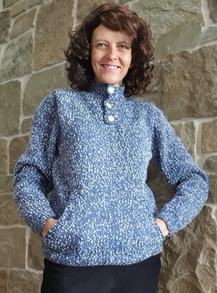 This sweater includes 6 sizes (3 ladies and 3 mens) and features a front pocket and buttoned neck. It has 1x1 rib bands and set-in sleeves.