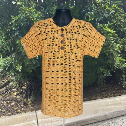 Crochet Pattern - Dallin Mens Henley Shirt - Create a stylish, breathable crochet Henley shirt with the Dallin pattern. This collarless, buttoned neck t-shirt design is perfect for summer and fall layering, available in 8 sizes (S–5XL), and works beautifully as a unisex garment for both men and women. Made seamless in rows of rounds bottom up to armholes so no sewing of side seams.
