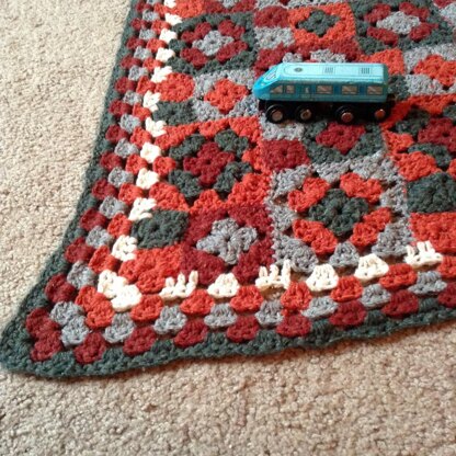 This granny square blanket is made by crocheting granny squares in three different sizes, then sewing them together. A border is added to the blanket after all the squares are sewn.