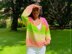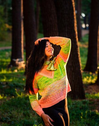 Danbury is a loose fitting, deep V-neck sweater with bell cuff sleeves. It uses FIVE yarn colours, and its colourful appearance is created by yarns held double stranded, holding two different colour yarns together at various intervals to create a marled effect. A formation of large eyelets adorn the hem and cuffs.