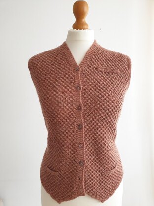 Mimicking a traditional fabric waistcoat, this design by Jennie Atkinson has pointed front hems, false pocket openings, and a neat fit. The front pieces are knitted in bramble stitch, while the back is in stocking stitch. The side seams have been designed to fall towards the back of the garment, and have ties to pull the back in if desired. Jennie’s pattern uses a sportweight wool from John Arbon.