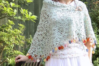 This shawl is constructed from sewn together equilateral triangle motifs, with edging added afterwards.