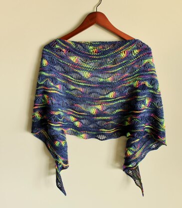 This lovely hand dyed yarn beautifully captures the colours of the northern lights dancing against a dark sky. With a simple combination of garter stitch and yarn overs these pretty colours get to dance across the dark background of this easy crescent-shaped shawl. It is worked from the top down with only knit stitches, yarn overs, and increase stitches, making it a quick and easy project. Choose a hand-dyed or hand-painted colourful yarn in fingering weight. Yarn shown here is Hilori's Magical Yarnorium Meri Jane in the limited edition prismatic colourway 'The Sky's Awake.'