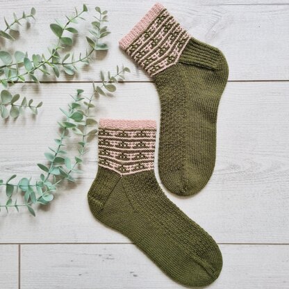 Techniques used : Socks are knit cuff down / Broken rib cuff / Mosaic pattern on the leg / Dotted pattern on the foot with purl stitches / 2 heel options : Heel flap + gusset, German short row heel / Rounded toe with simple decreases / Grafting / Pattern includes row by row charted and written instructions