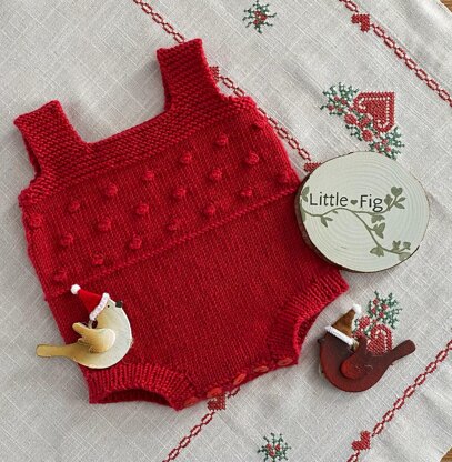 The romper is worked from the bottom up, with front and back tabs worked separately then joined and worked in the round. The bib section is worked with a garter stitch edging and straps, and bobble stitch.