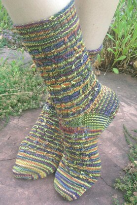 Elongated slip stitches and lace highlight variegated yarn, pulling the colors back and forth like gravitational force.