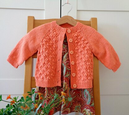 Worked flat on a circular needle from the top down, this pretty baby cardigan features a lovely textured knitting stitch in fronts and stocking stitch in back and sleeves, yoke is shaped with raglan increases, pattern is all charted and also writing instructions, you won’t have any problem in follow the instructions.