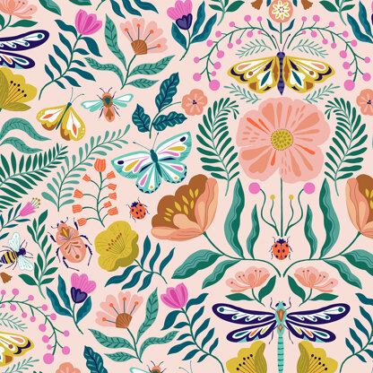 Inspired by gardens bursting with blooms and the beautiful butterflies and the little creatures that live amongst the flowers. Decorative florals and foliage are celebrated in a bright summery palette along with dancing dragonflies, snails, bees and ladybugs.