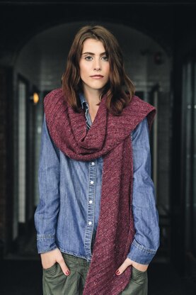 Generous sized shawl/scarf in a simple but effective garter stitch ridge pattern. The shawl is worked on the bias to create drape and diagonal stripes. It is also gently shaped to create an elongated triangle.