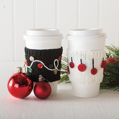 Day and Night is a simple set of matching holiday cup cozies that beginner knitters will love. The Day design features a light background with Christmas baubles hanging on strings while the Night design features a dark background with strings of Christmas lights weaving around the cup. Perfect for holiday gifts!