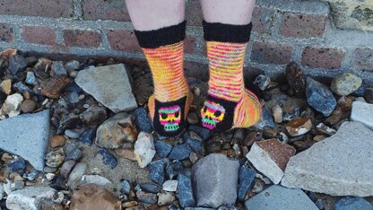Inspired by colourful Day of Dead images this is a cuff down sock with flap heel and basic stranded colourwork