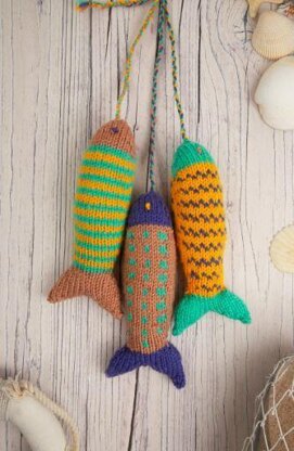 This is a pattern for a decorative fish hanging ornament, originally published in Your Crochet and Knitting. It has a striped, and two Fair Isle fish, shaped and stuffed with toy stuffing with embroidered eyes, and with plaited ties to hang from a hook. The yarn used is a kit yarn and not commercially available, so an alternative yarn matching the colours has been used in the pattern. Photo Your Crochet and knitting.