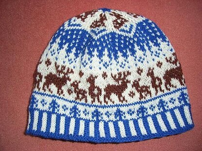 The beanie starts with a two-colored ribbing in blue and white, has a small tree border (peerie) pattern. Then comes the band of the deer family with mommy deer, daddy deer and the little fawn. Behind them you can see the forest covered in snow. The upper half of the beanie is covered by falling snow and a big white star with 6 little sitting fawns in them. And a tiny small blue star is in the middle of the crown.