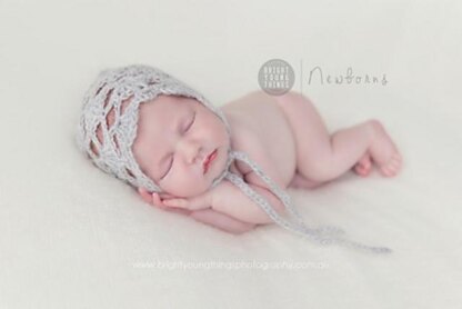 This sweet newborn bonnet incorporates shell stitches in a lovely open work style that makes it ideal for newborn photography.