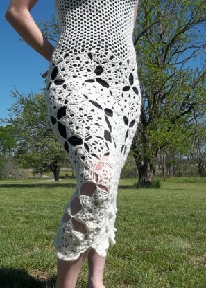 This elegant dress is made in strips of motifs that are joined together as you work. Its worked from the hips down, then after the motifs are finished the bodice is made from the hips up. Even though the sizes are all with a 6" difference, the motifs have a lot of ease so pick the size closest to what you need.