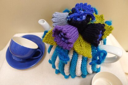 This retro style tea cosy has an abundance of bright blooms and leaves on top in shade of blue. The centre one and the ends of the “I Cords” have little delphinium blue Swarovski crystals adorning them for a bit of added glamour. Naturally you can leave this off if you would like a slightly plainer cosy. The entire cosy is knitted in 8 ply making it a fairly quick knit but take your time with the finishing for a truly spectacular result. If you are not keen on blue you could always choose an alternate colour scheme.