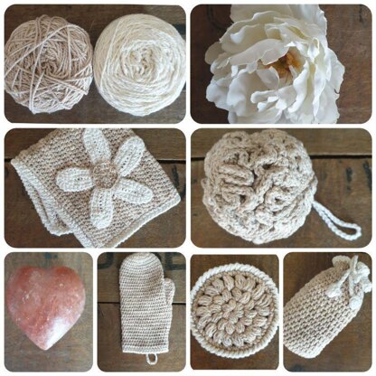 The pattern includes step by step photo tutorials to make a bath pouf, bath mit (right and left hand), face scrubbies, face cloth and soap saver.