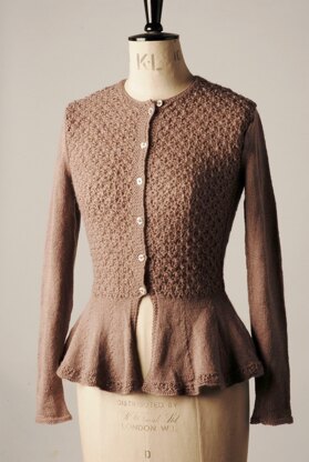 Demeter is a pretty jacket knitted in a light 4ply yarn. The jacket has a lace pattern at the front and sleeves, a flared peplum and tie belt.