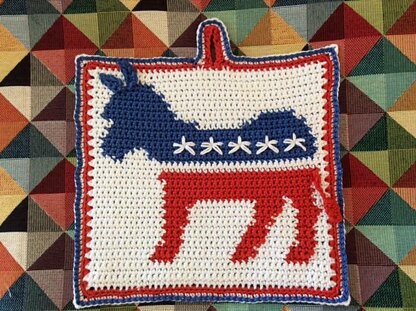 This is an original pattern for a colourful crocheted double thickness potholder with the instantly recognizable Democrats' logo of an donkey on the front. The reverse is plain blue, and both thicknesses are joined by a double row of crochet in red and white with attractive braid effect in blue.