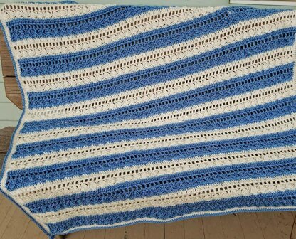 The Denim & Ivory Lapghan measures 46" W x 48" H. It would make a great wheelchair afghan, a blanket for when you're curled up on the couch with a hot drink and a good book or just relaxing in your recliner watching TV. It would also make a beautiful baby or toddler blanket as well.