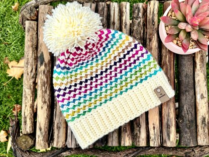 This stunning beanie features a striking diagonal stitch pattern that looks intricate but is surprisingly easy to create. Perfect for beginners and experienced crocheters alike, this pattern works up quickly, making it a satisfying weekend project. The design is ideal for using up leftover yarn from your stash. With its eye-catching contrast, this beanie is as fun to make as it is to wear! The cozy design is perfect for keeping your and your loved ones heads warm this winter and makes a thoughtful, handmade gift for the holiday season!