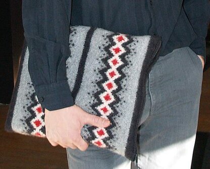 Skill level: Adventurous. Requires knitting in the round, reading a color chart, stranded color work, felting, and applying a zipper for closure.