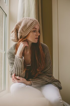 Slouchy beanie hat in a diamond relief stitch.
