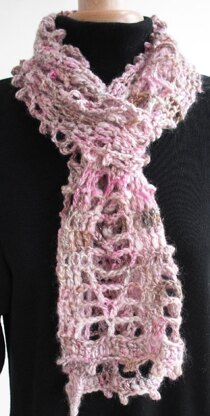 I fell in love with this yarn. It was a lone skein of hand-spun hand-dyed made using soy silk, tencel, merino wool, baby camel and a sparkle thread, in creams, browns and pinks. There was only one, it is unique. So I bought it. But what to do with a single skein – just over 125m of lovely bulky yarn? It had to be scarf, something light and airy but also simple, to show off the yarn. And long enough to wrap round the neck several times to keep you warm. And it had to be quick, I was impatient as I wanted to use the yarn quickly! And I wanted to use every little bit of the yarn, which I did. I think the end result shows the yarn off well, but it is so difficult to show the sparkles in photographs. The scarf can be made to any yarn weight but I recommend at least a bulky yarn (Rowan Cocoon is a favourite of mine and would work well with this). Please note that as I used a handspun yarn it may block different
