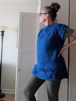 This is an oversized sweater vest with a diamond openwork design. It can be worn with a short or long sleeve top or blouse. It is made with a bulky, acrylic/wool blend yarn that is lightweight and warm. Worked flat. The pattern includes 6 sizes, including a chart and a schematic. Sizes: XS, S, M, L, XL. 2XL. Yarn Weight: Bulky. Knitting Needles: US 6 and US 10