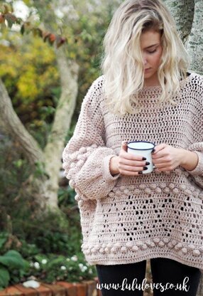 This boxy jumper has been designed to be oversized. The diamond filet and bobbles give it beautiful cosy texture. Its simple construction makes it a perfect project if you are new to crocheting garments.