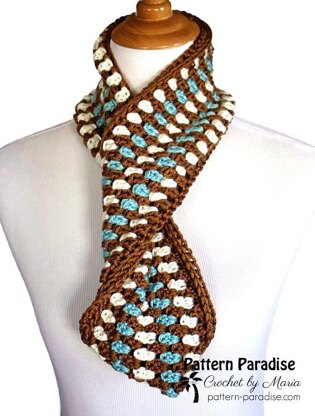 The rows of color combined with the stitch remind me of little gems. I love how they interlock with each other resembling a piece of jewelry. This cowl measures approximately 7” x 32” for maximum wearing flexibility, but it is easy to adjust it to whatever length you like.