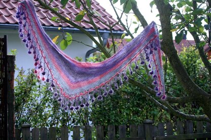 This pattern combines a knitted triangle with a crocheted border. I think it is an easy to knit/crochet project dedicated for the advanced beginner as well in knitting as in crochet. The crochet border is given in words as well as in a photo tutorial. You will need 1 ball of Rowan Kidsilk Haze Stripe (50 g) or 1 ball of Lana Grossa Silkhair Print.