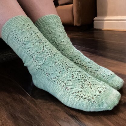 This pretty lacework sock comes in five sizes and is perfect for showing off that gorgeous tonal in your stash. The lace runs down the center of the sock, with stocking stitch surrounding it. It has an eye of partridge heel and is worked top-down with a heel flap and gusset. Toe is closed using Kitchener stitch - or your favourite method for grafting.