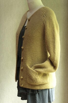 A sweet little garter-stitch jacket with brioche stitch raglan shaping, a cute pouch-shaped pocket, and (optional) knitted toggle buttons.