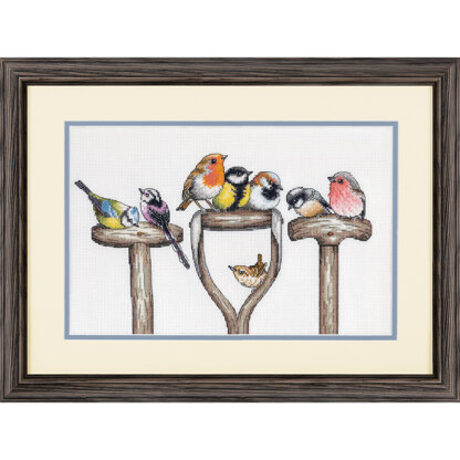 Perched on an arrangement of garden tools, it looks like these eight feathered friends are formulating their plans for the day in this charming counted cross stitch design