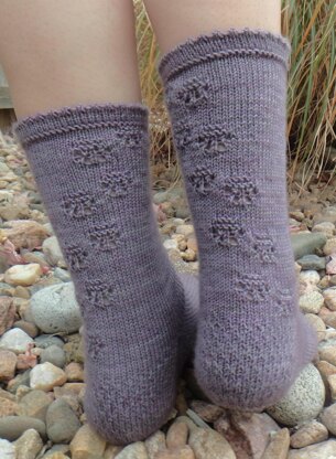 Little cat paws prance down the leg of this pretty, picot hemmed sock; the paws are formed by easy lace and garter texture.