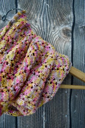 This simple cowl is knit using a simple lace pattern that is easy to memorize and only a four row repeat!. This single skein cowl has an increasing section to give a nice drape to the cowl while wearing it.