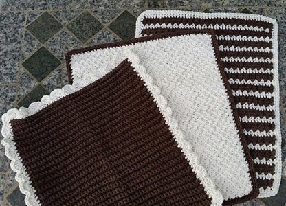 This pattern is for 3 separate dish towels, which can also double as dish drying mats. I used three balls of Taupe and three balls of Ecru to complete all three mats.