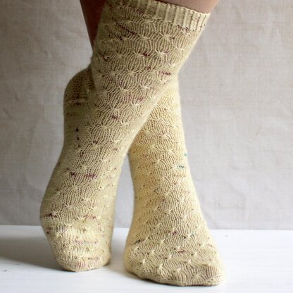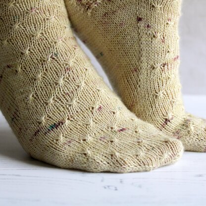 Meaning flowers in Scottish Gaelic, Dìtheanan is a simple and fun sock covered with a scattering of little flower motifs from toe to cuff! The pattern looks stunning in solid, semi-solid or (my favourite) speckled yarn. Knit from the toe up with a gusset and heel flap the socks have flexible length fitting in both the foot and the leg. Dìtheanan is a great mix of relaxing knit and engaging pattern – perfect for travel knitting or chilling with a film!