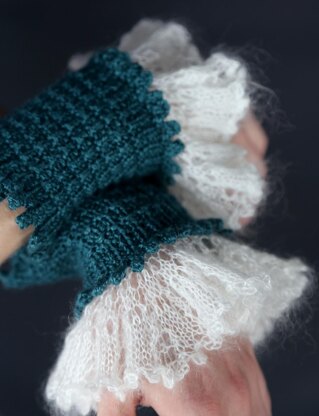 These frilly wristlets and cowl are over-the-top feminine. The lace mohair ruffle cuffs add a dainty and luxurious touch. The cowl can be worn with the ruffle facing up or down, depending on your desired look. I used vintage buttons that blend in with the green yarn, but contrasting buttons could be used for even more of a statement. Picot cast ons and bind offs galore are present, giving you lots of opportunity to practice the techniques.