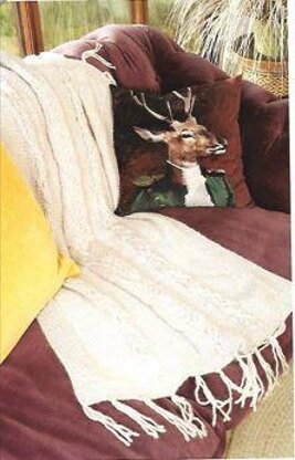 Diverging cable throw, originally published in Knitting magazine. It has two cables, a diverging cable and a wrapped cable. The edges are garter stitch with tassels on the ends.