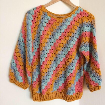 A dk C2C (corner to corner) crochet jumper with instructions for matching the diagonal pattern along the sleeves. It includes individual charts and instructions for each size to make the C2C easy and fun!