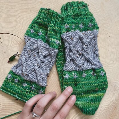 This pattern is very near and dear to my heart, I made these in honour of my husband and I’s wedding! It has simple colour work stars and interlocking rings cable, now in DK!